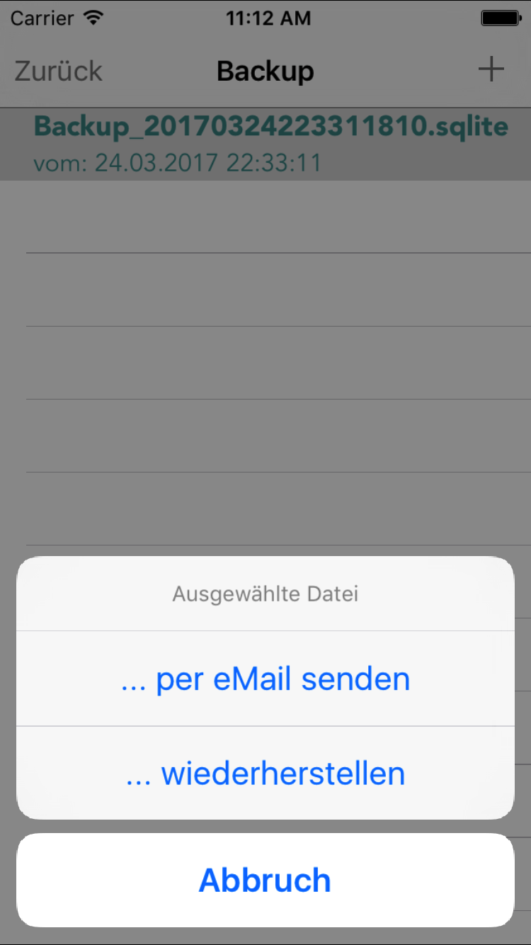 Sichern Sie Ihre lokale Datenbank mit „+“. Eine jeweilige Sicherung können Sie wiederherstellen indem Sie die entsprechende auswählen und lange auf diese Auswahl drücken: