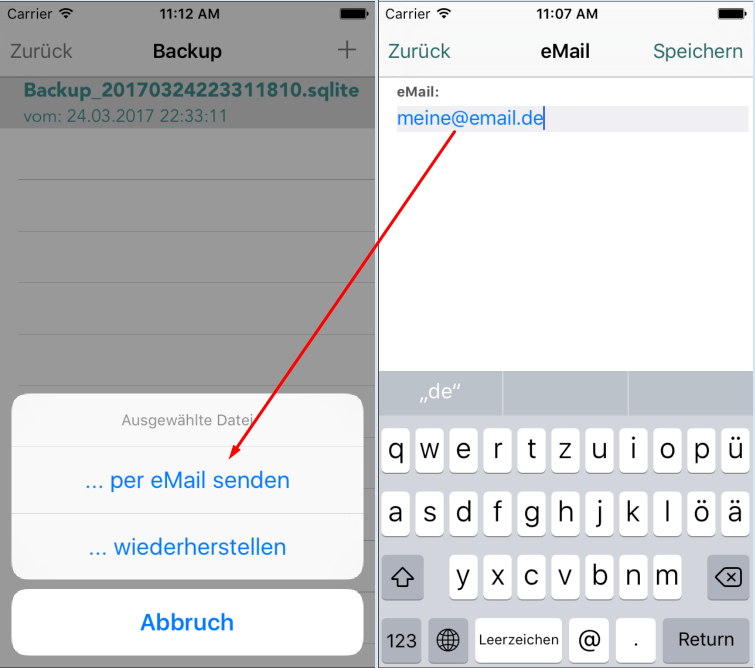 Ist unter „eMail“ in den Einstellungen eine gültige eMail hinterlegt erscheint zusätzlich die Auswahl „..per eMail senden“. Hiermit haben Sie die Möglichkeit eine Sicherung dezentral zu speichern sowie z.B. auch den jeweiligen Datenbankstand auf anderen Geräten außerhalb der iCloud zu installieren. Folgen Sie dazu den Anweisungen in der eMail.